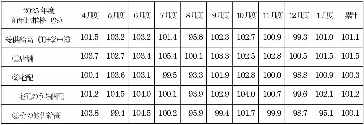 | 日本生活協同組合連合会(略称:日本生協連、代表理事会長:新井 ちとせ)は、全国66主要地域生協の2026年2月度の供給高(売上高)の速報をまとめましたので、ご報告いたします。 | |||