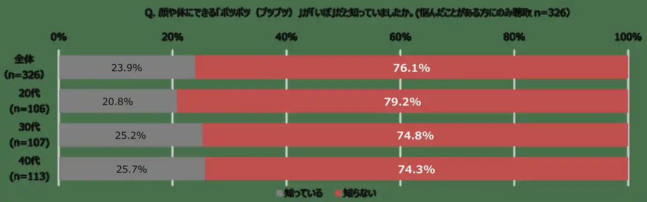 続いて、前項で「悩んだことがある」と回答した人にお肌にできる“ポツポツ” の正体が「いぼ」であると知っていたかと尋ねたところ、「知らない」と答えた方は76.1%に達しました。約8割の方が、自身の肌トラブルが「いぼ」であると認識しておらず、そのために適切な対処法に結びついていない可能性が考えられます。 |