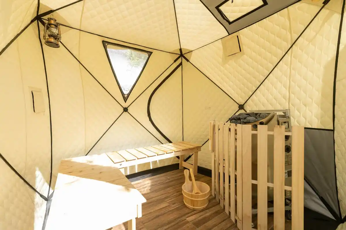この2日間は、12人用のテントサウナを2基設置し、アウフギーサー(熱波師)による熱波をお愉しみいただきます。サウナの後は水風呂代わりに温水プールへ。サウナ飯やドリンクを愉しめる「ととのいスペース」もご用意いたします。 |