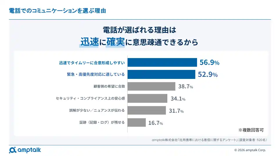 一方で電話は、「迅速でタイムリーに合意形成しやすい(56.9%)」や「緊急・高優先度対応に適している(52.9%)」といった、スピードと確実な意思疎通を目的として選ばれています。 |