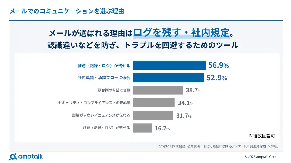 次に、「メール」と「電話」が選ばれる理由については、ユーザーがそれぞれの特性を明確に使い分けていることが分かりました。 メールが選ばれる最大の理由は「証跡(記録・ログ)が残せる(56.9%)」や「社内稟議・承認フローに適合する(52.9%)」といった、トラブル回避や社内規定への対応を目的としたものです。 |