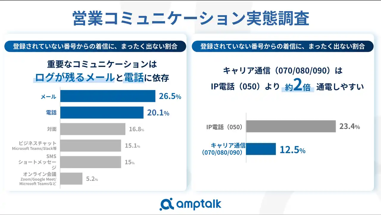 商談データを資産に変え、営業組織の成長を支援するamptalkは、日本企業におけるコミュニケーションチャネルの選択実態と、番号種別(携帯番号 / IP電話番号)による応対率の差を明らかにすべく、「営業コミュニケーション実態調査」を実施いたしました。ビジネスの重要局面で選ばれるチャネルを特定し、営業コミュニケーションの最適化に向けた示唆を考察しています。 |