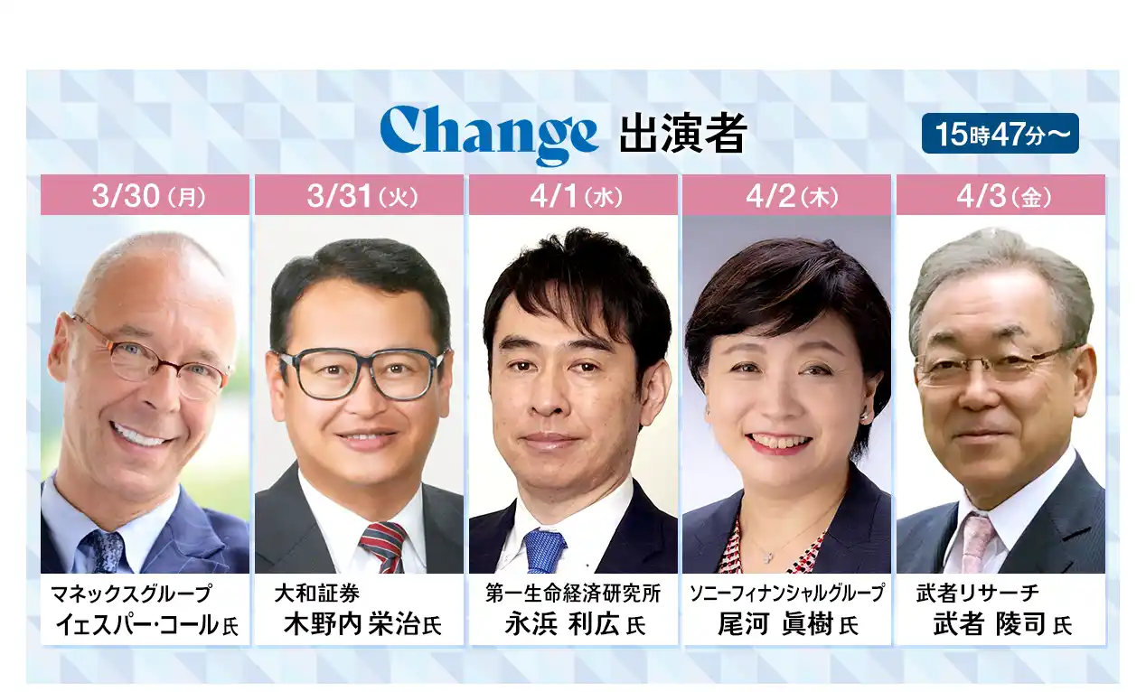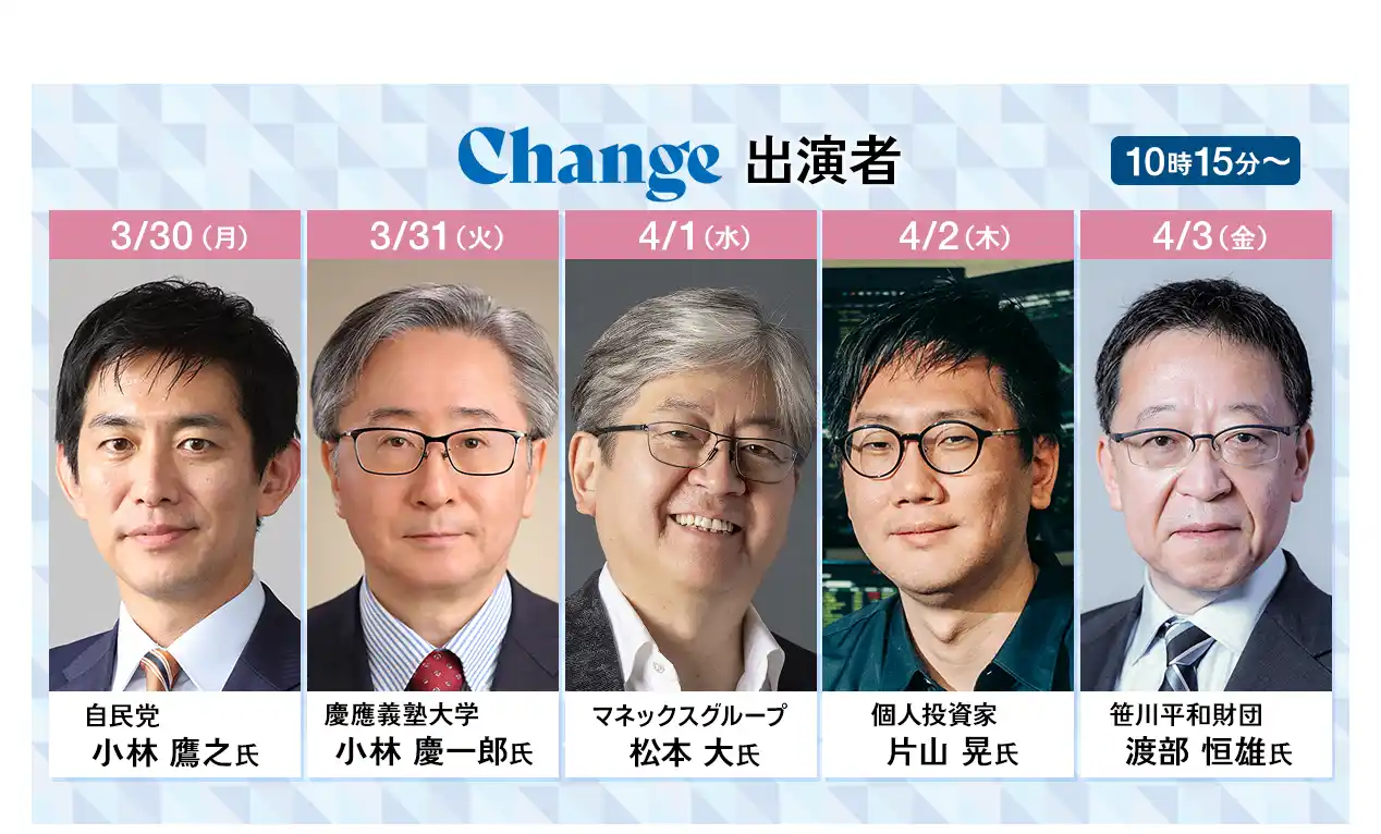 春改編スペシャルウィークでは、3月30日に新コーポレートロゴとともに生まれ変わる日経CNBCの新スタジオからお届けします。激変する市場環境のもとで「Change(変化)」をテーマに、小林鷹之・自民党政調会長、政府の経済財政諮問会議の民間議員である永浜利広氏をはじめ、各界第一線で活躍する豪華ゲストが続々出演し、いま投資家が最も知りたい話題について討論していきます。 |