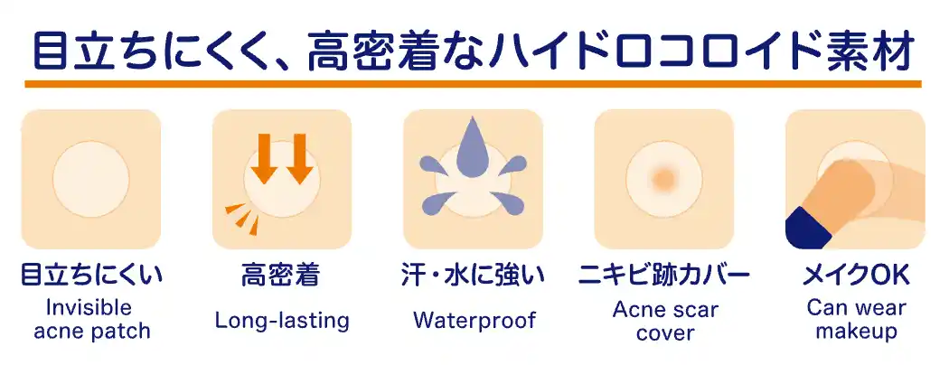 長時間密着する高密着ハイドロコロイド素材を採用しており、非常に薄く目立ちにくいのが特長です。
