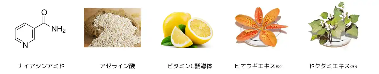 美容分野で注目されている成分として、ビタミンB3の一種であるナイアシンアミド、穀物由来のアゼライン酸、そして浸透性を高めたビタミンC誘導体を採用しています。 |