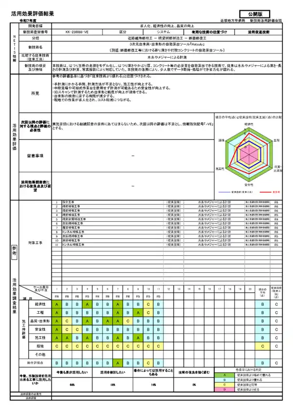また、「実施報告書」や「活用効果調査表」の提出が不要となり、手続き負担が軽減されるため、より迅速な導入が可能になります。評価については、「経済性」「工程」「品質・出来形」「安全性」「施工性」「環境」の項目でそれぞれ評価され、「環境」では「従来技術と同等」、その他の項目では全て「従来技術より優れる」と判定されました。さらに、総合評価でも「従来技術より優れる」という高い評価を得ることができました。また実際にご利用いただいたユーザの皆様のうち、68%の方に「今後も是非活用したい」、18%の方に「活用を検討したい」とご評価いただくことができました。