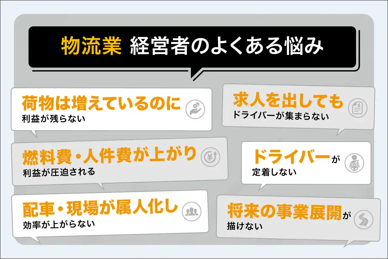 物流業では、 ・ドライバー採用と定着の課題 ・燃料費や人件費の高騰による利益圧迫 ・配車や現場判断の属人化 ・荷物量は増えているのに利益が残らない構造 ・将来の事業展開や投資判断の不透明さ |