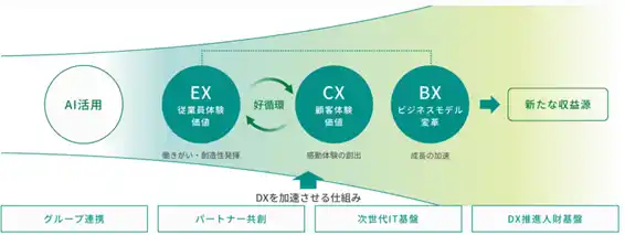 DX ビジョンに基づき、働きがいを実感する従業員による質の高いサービスが、お客さまの感動体験を生み、さらに従業員のモチベーションを向上させるような EX と CX の好循環につなげていきます。積極的な AI 活用を起点としたこのサイクルを、グループ連携やパートナー共創、DX 推進を支える基盤の強化によって加速させ、ビジネスモデル変革とその先の新たな収益源の獲得を実現することが DX による価値創造を考えております。 |