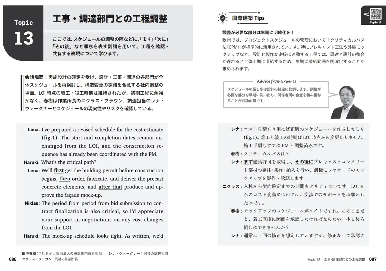| プログラムでは、海外拠点の運営に欠かせない実務テーマをもとに学習を進めます。実際の海外事業の現場で発生するシーンを想定したケーススタディを中心に構成しています。実践的なテーマに基づく学習により、社員は海外パートナーや現地スタッフとの協働の中で求められる“事業を確実に前進させる英語コミュニケーション力”を、ロールプレイなどを通じて身につけることを目指します。 | |||