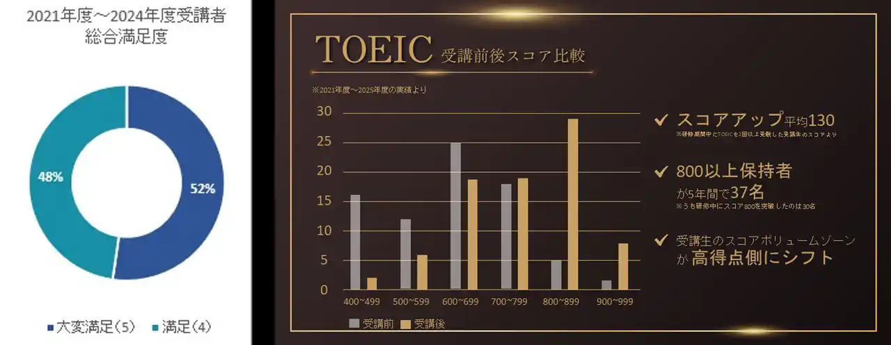 旭化成ホームズは、2024年度の売上9,935億円のうち約2割強を海外事業が占め、北米・豪州を中心に事業を拡大してきました。海外事業の売上は、2021年度の1,463億円(海外人員約1,600名)から、2024年度には約2倍となる2,930億円(海外人員約4,500名)へと大きく成長し、2027年度には4,000億円の達成を目指しています。 このように海外事業の拡大が進む中、海外で活躍できる人材の育成は当社にとって重要な課題の一つでした。 そこで2021年度より、ツクルロマンが提供する英語強化プログラムを導入し、2024年度には第4期生が修了しました。本プログラムは1年間にわたり、毎期約10~15名を対象に週4回(グループ・個人)のレッスンを実施。レッスン後の自宅学習も含め、年間で1000時間英語学習に集中的に取り組む内容となっています。 2021年度~2024年度修了者44名を対象に実施した満足度アンケートでは、全体の90%が「満足」と回答しました。また、TOEICスコアは受講前と比較して平均130点アップし、800点以上の保持者は約37名に増加しています。 |