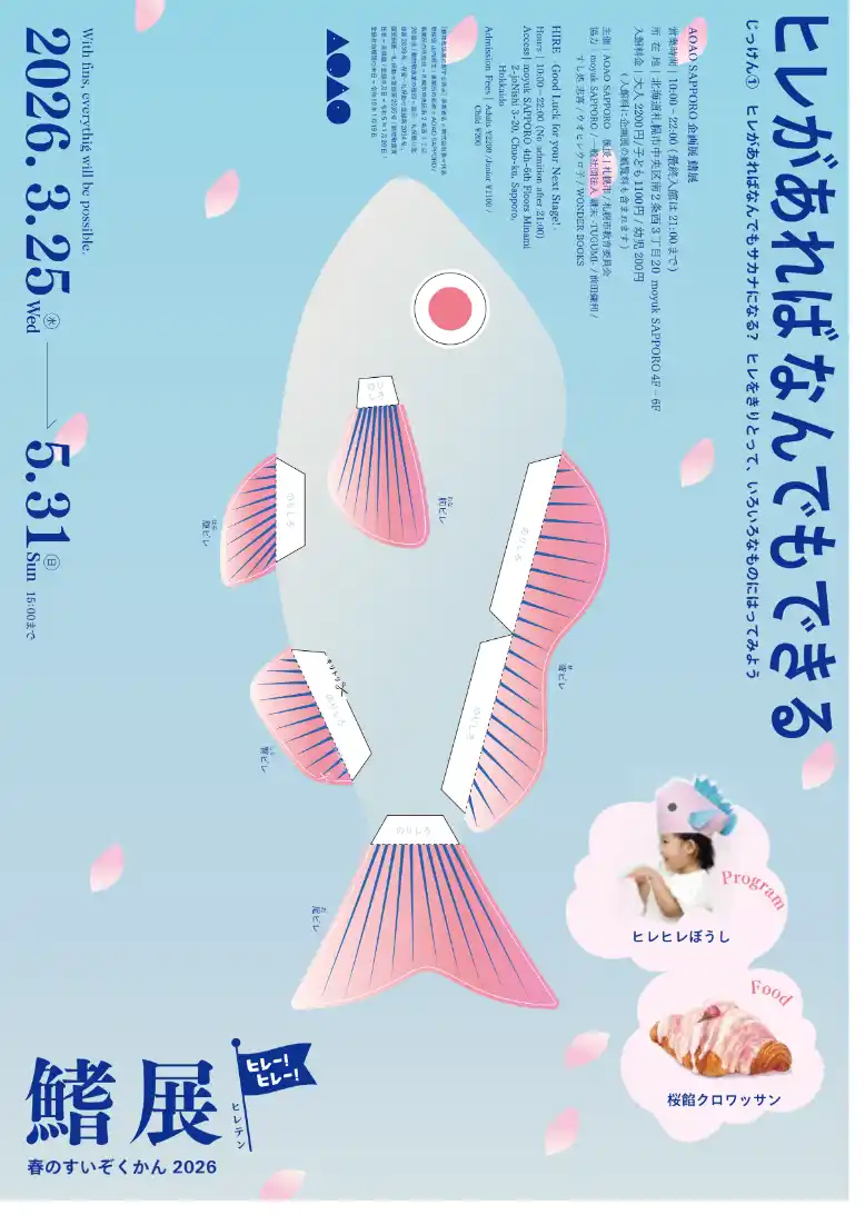 期待と不安が入り混じる春、AOAO SAPPOROは新生活を迎える人を応援する「鰭展2026 ~ヒレがあればなんでもできる~」を開催します。 「鰭展」は長い時間をかけて進化してきたサカナたちのヒレに注目した企画展です。サカナたちは生息環境や成長度合いに合わせてヒレの形状や動作の仕組みを多様に進化させてきました。進化と適応の証とも言えるヒレのことを知ると、新生活からなんでもできる気になる!をコンセプトに、AOAO SAPPORO独自のヒレ学「ヒレオロジー」の展示でヒレのワンダー(不思議)に迫ります。 |