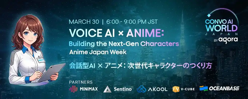 東京、2026年3月24日 - AIがキャラクターの創出、体験、収益化の在り方を急速に変革する中、Agoraは2026年3月30日、東京都千代田区にて「Voice AI × アニメ:次世代キャラクターのつくり方」を開催します。本イベントは会話型AIがアニメキャラクターおよびインタラクティブIPの未来をどのように再定義しているのかを探るべく、開発者、クリエイター、スタートアップが一堂に会します。 |