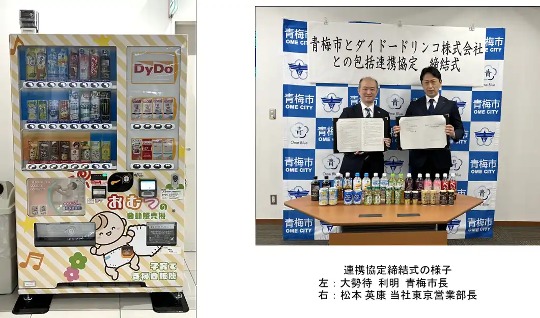 【ダイドードリンコ株式会社】 ダイドードリンコと東京都青梅市が包括連携協定を締結 取り組みの一環として「災害対応子育て支援型自動販売機」を設置
