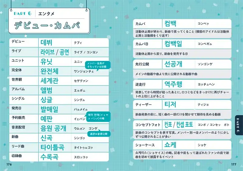 | ただ単語を載せるだけではなく、ニュアンスがわかる豆知識や使い方のヒントも掲載。「ティーザー」「ショーケース」のような推し活ならではの表現や、意味が特徴的な最新用語にはミニ解説がついています。 | |||||||||||