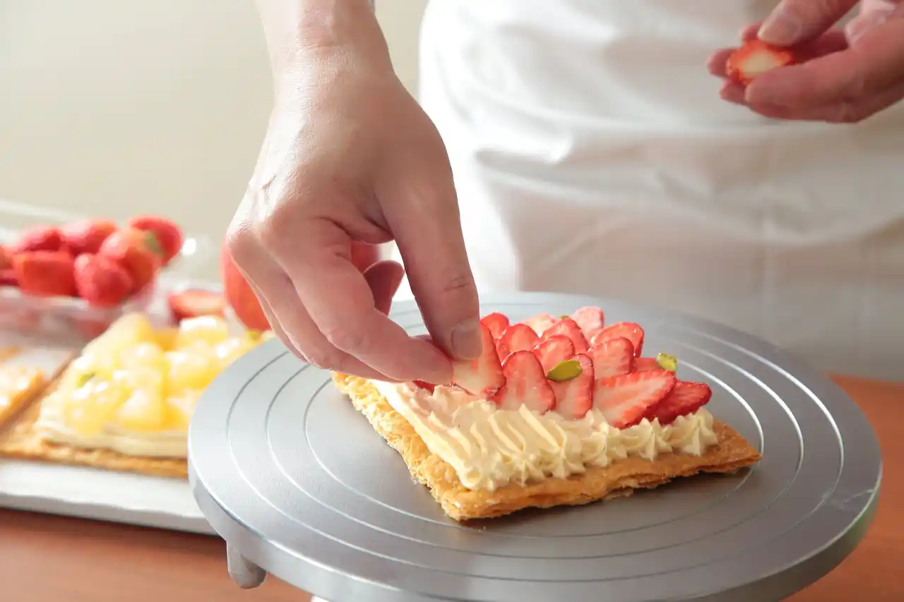 パティシエがカウンターでデザートを仕上げる(イメージ) |