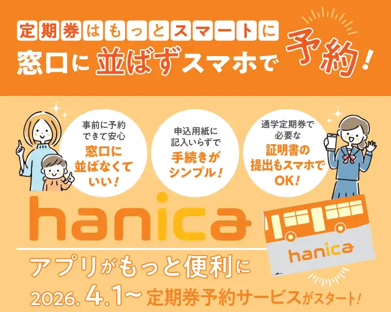 レシップホールディングス株式会社(本社:岐阜県本巣市、代表取締役社長:杉本 眞)の連結子会社レシップ株式会社(本社:岐阜県本巣市、代表取締役社長:北野 元昭、以下:レシップ)は、阪急バス株式会社(本社:大阪府豊中市、社長:三田 和司、以下:阪急バス)にて利用できる「hanicaアプリ」において、定期券予約機能を追加し、2026年4月1日よりサービスを開始することをお知らせします。 |