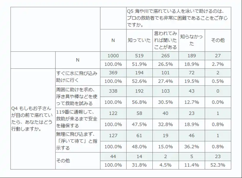 | 設問:「もしお子さんが目の前で溺れていたらどう行動しますか」 | |||
