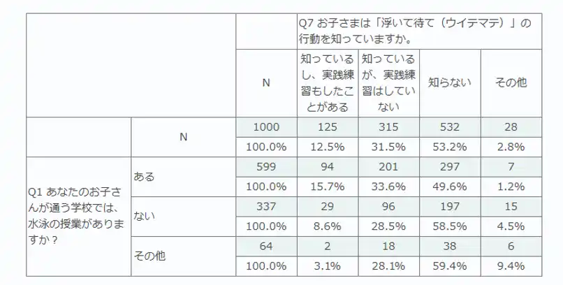 | 全国では「浮いて待て」の実践したことがない層が87.5%、親の危険理解度は78%であるものの、すぐに飛び込んで助けるとの回答は36.9%と、約9割の子どもは浮けないが、4割の親は危険を承知で飛び込むという構造が明らかになった。 | |||