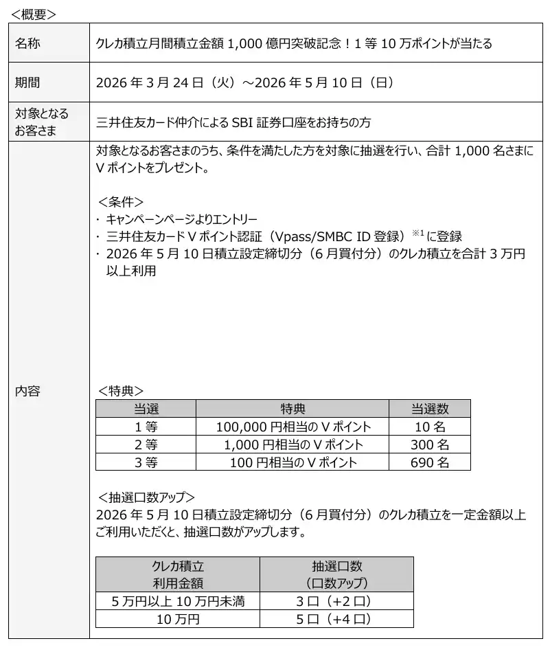 三井住友カード株式会社(本社:東京都江東区、代表取締役 社長執行役員 CEO:大西 幸彦、以下:三井住友カード)と株式会社SBI証券(本社:東京都港区、代表取締役社長:高村 正人、以下:SBI証券)は、2026年3月に「三井住友カード つみたて投資(クレカ積立)」の月間積立金額が1,000億円を突破したことをお知らせいたします。 |