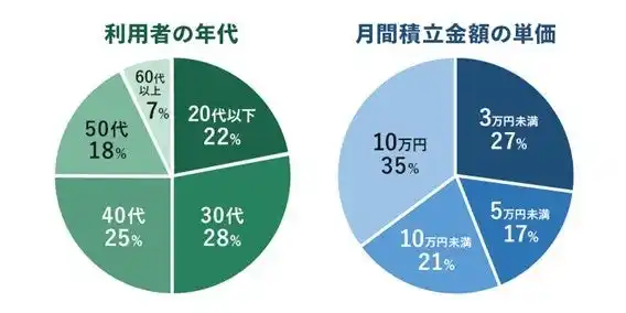 「三井住友カード つみたて投資」をご利用のお客さまは、30代以下のお客さまが半数を占めるなど、若い世代の方を中心に幅広い年代のお客さまにご支持いただいております。月間積立金額は10万円のお客さまが最も多く、まとまった金額での積立投資にご活用いただいている点も特徴です。 |