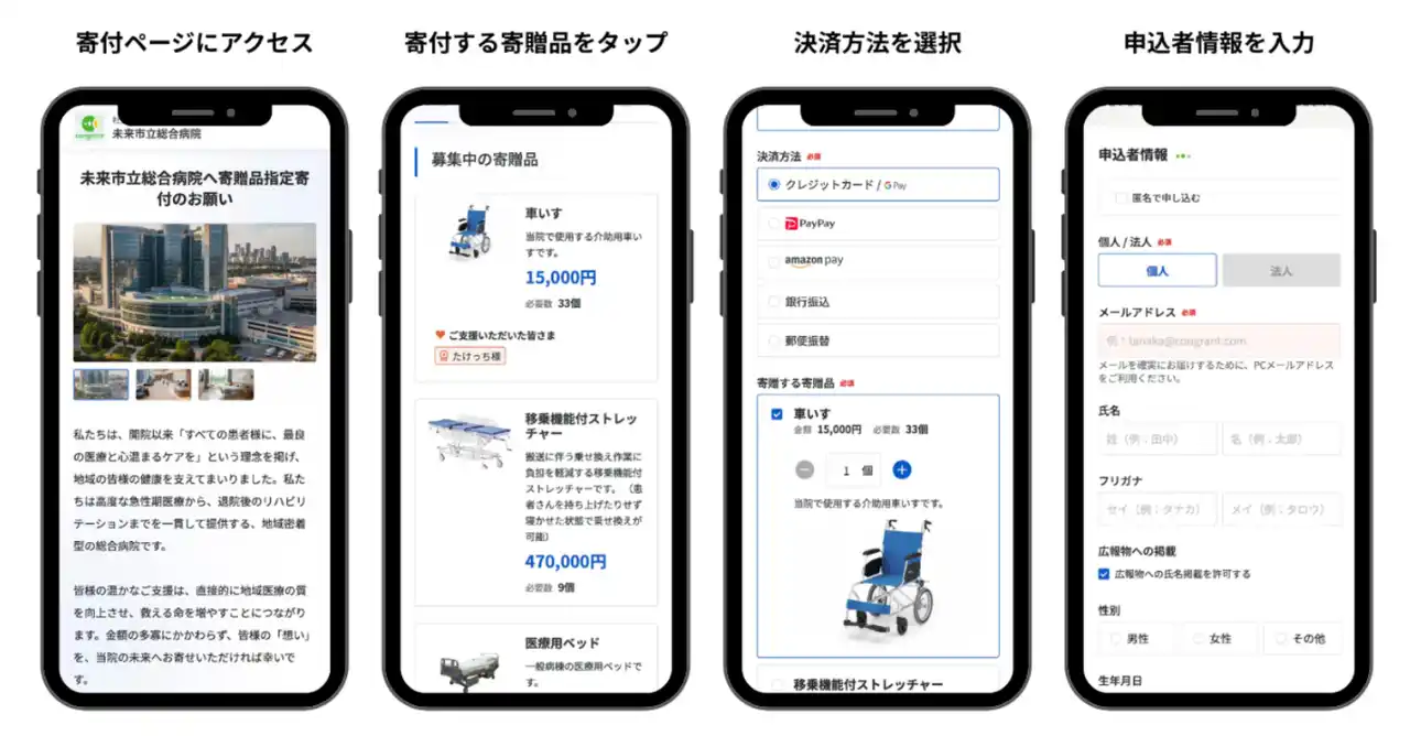 寄付DXシステムにおいて、医療機関が必要とする物品を指定し、その購入費用を寄付として募る機能としては国内初です。(自社調べ、2026年3月時点) |