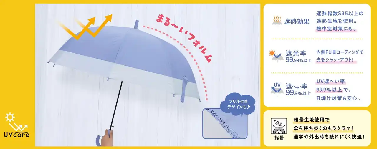 新商品は背おっている荷物ごと、体をすっぽり覆う丸いフォルムが特長です。傘の生地は、熱中症対策として遮熱効果・内側PU黒コーディングによる遮光率99.99%以上・日焼け対策としてUV遮蔽率99.9%以上の機能付きで、強い日差しの中での通学や外出時にも安心して使えます。 |