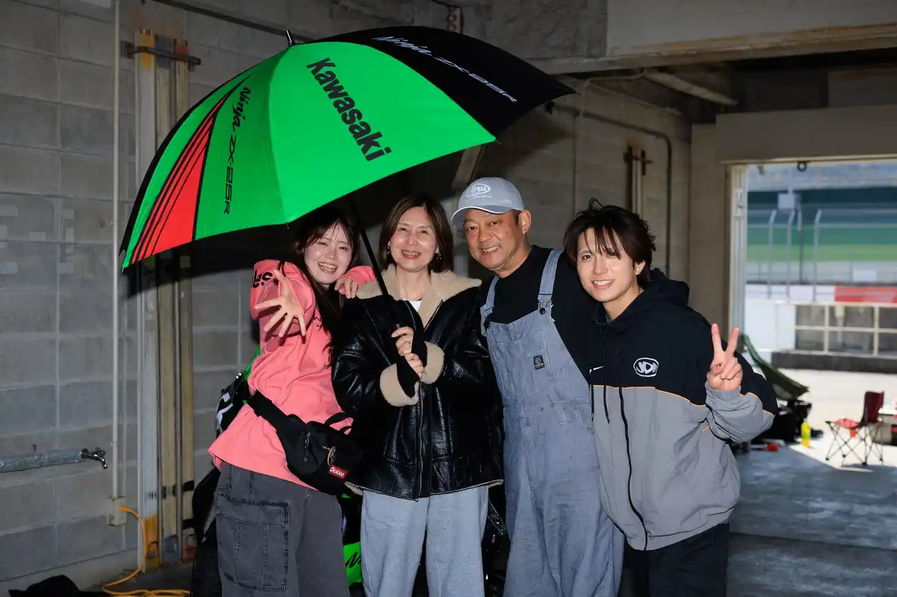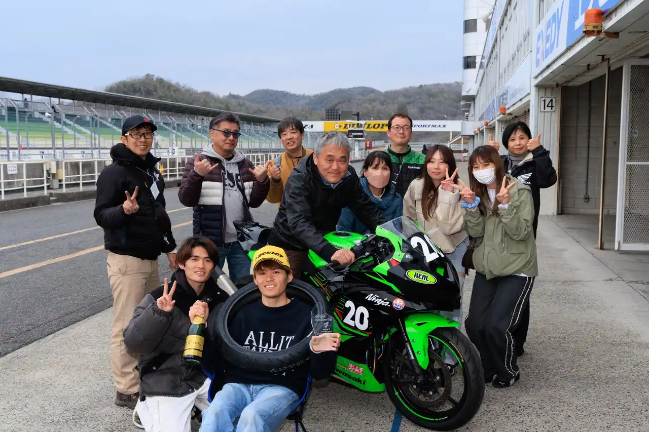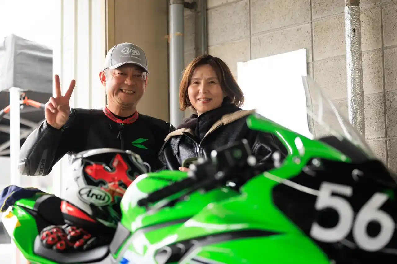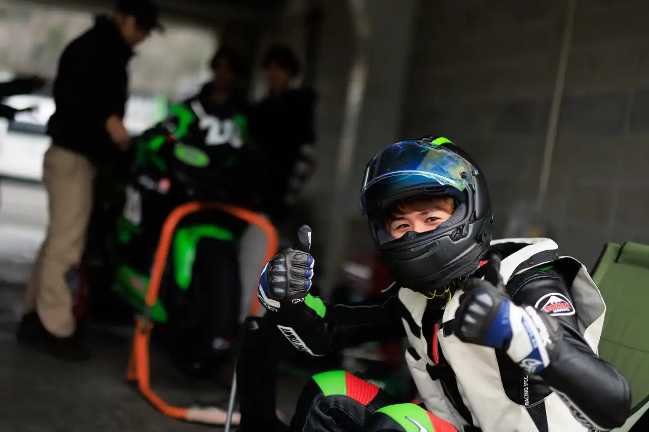 もともと妻がNinja ZX-25Rを所有してたのですが、大型二輪免許を取得してステップアップしたことで、そのNinja ZX-25Rが手元に残っていました。そんな中、昨年岡山国際サーキットで開催された全日本ロードレース選手権を観戦しに行き、カワサキプラザブースで展示されていたNinja Team Green Cup仕様のNinja ZX-25Rを目にしました。そこでプラザスタッフの方から詳しく話を聞き、「それなら家にあるNinja ZX-25Rで挑戦できるかもしれない」を思ったのがきっかけです。その後、近くのカワサキプラザを探して相談し、同じカワサキプラザに通うお客さんと一緒に出場することになりました。 |
