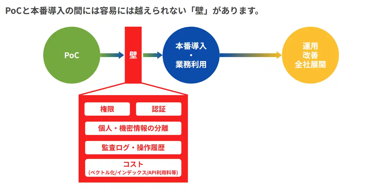 PoCから実運用へとフェーズが移行する際、以下の技術的・運用的課題が急浮上します。 |
