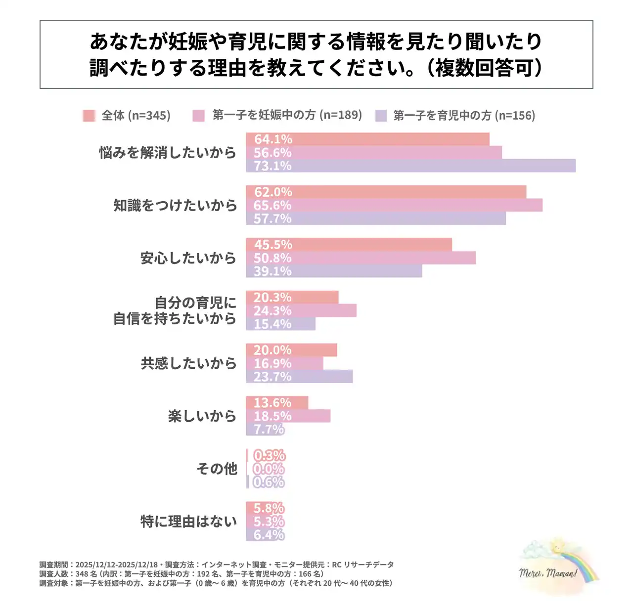 ・妊娠や育児に関する情報を見たり聞いたり調べたりする主な理由は「悩みを解消したいから」「知識をつけたいから」「安心したいから」 |