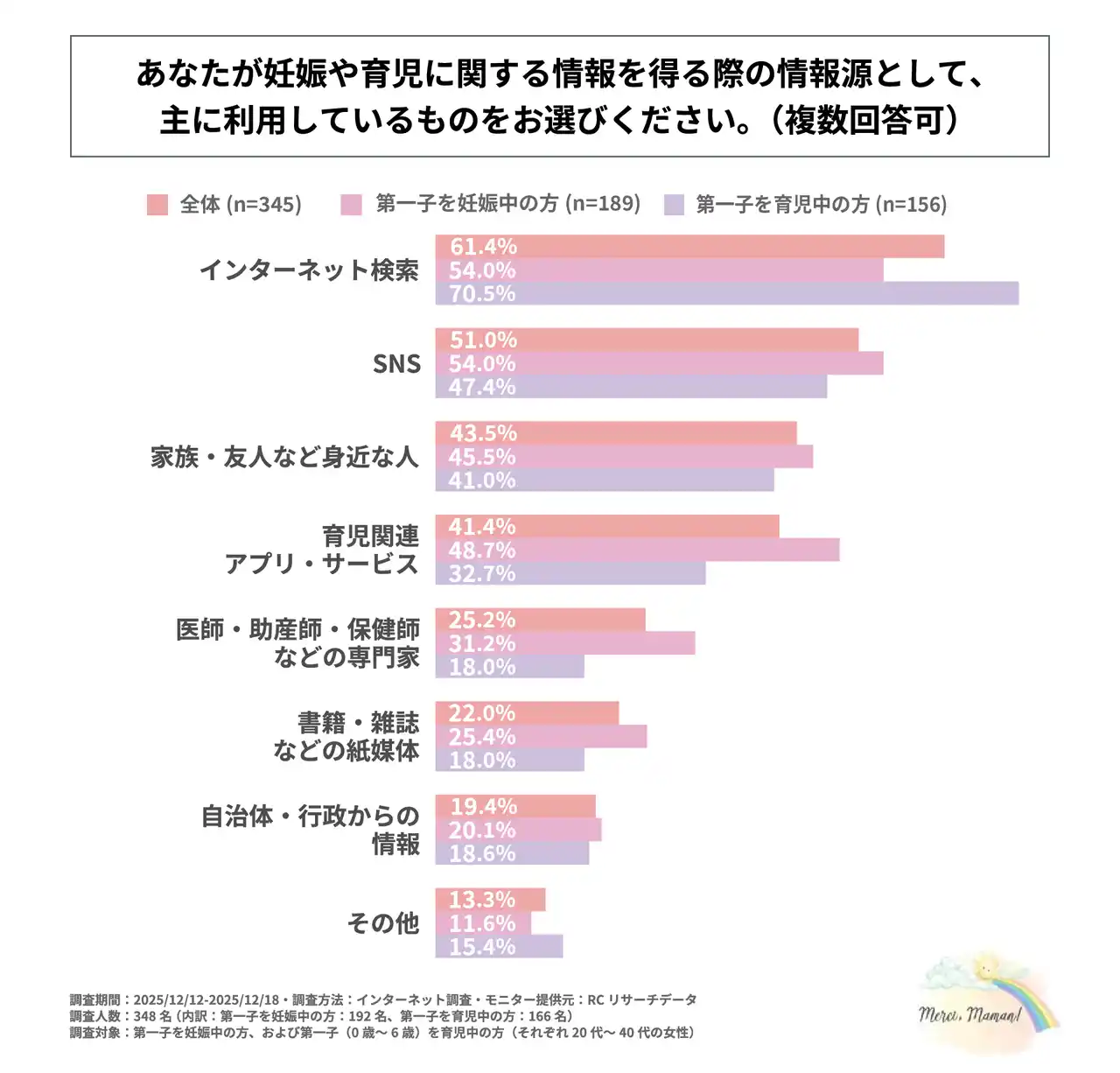 妊娠や育児に関する情報を得る際の主な情報源は「インターネット検索」「SNS」「家族・友人など身近な人」だが、第一子を妊娠中の女性はその約半数が「育児関連アプリ・サービス」も情報源にしている |