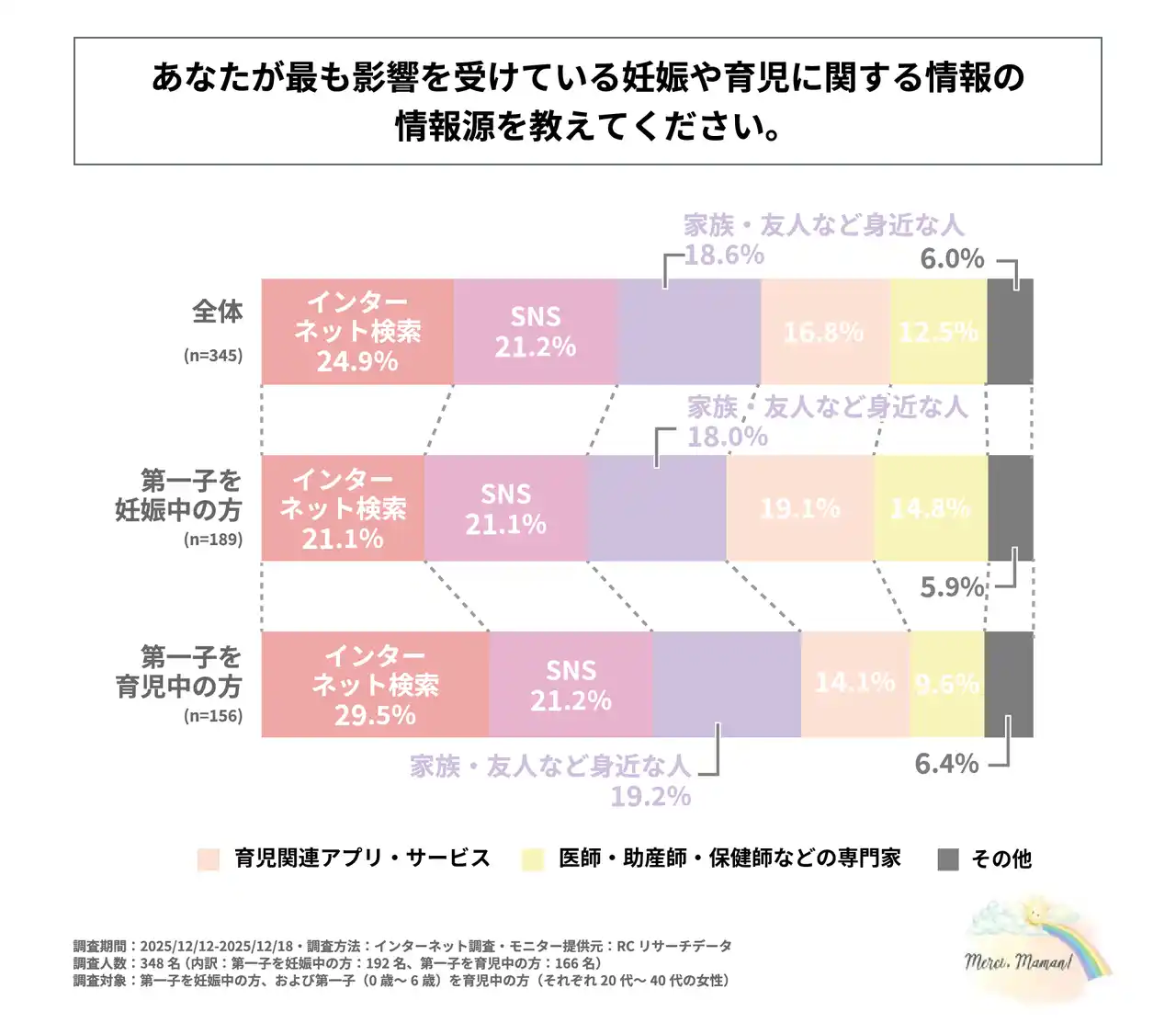 ・妊娠や育児に関する情報を得る際の主な情報源は「インターネット検索」「SNS」「家族・友人など身近な人」だが、第一子を妊娠中の女性はその約半数が「育児関連アプリ・サービス」も情報源にしている |