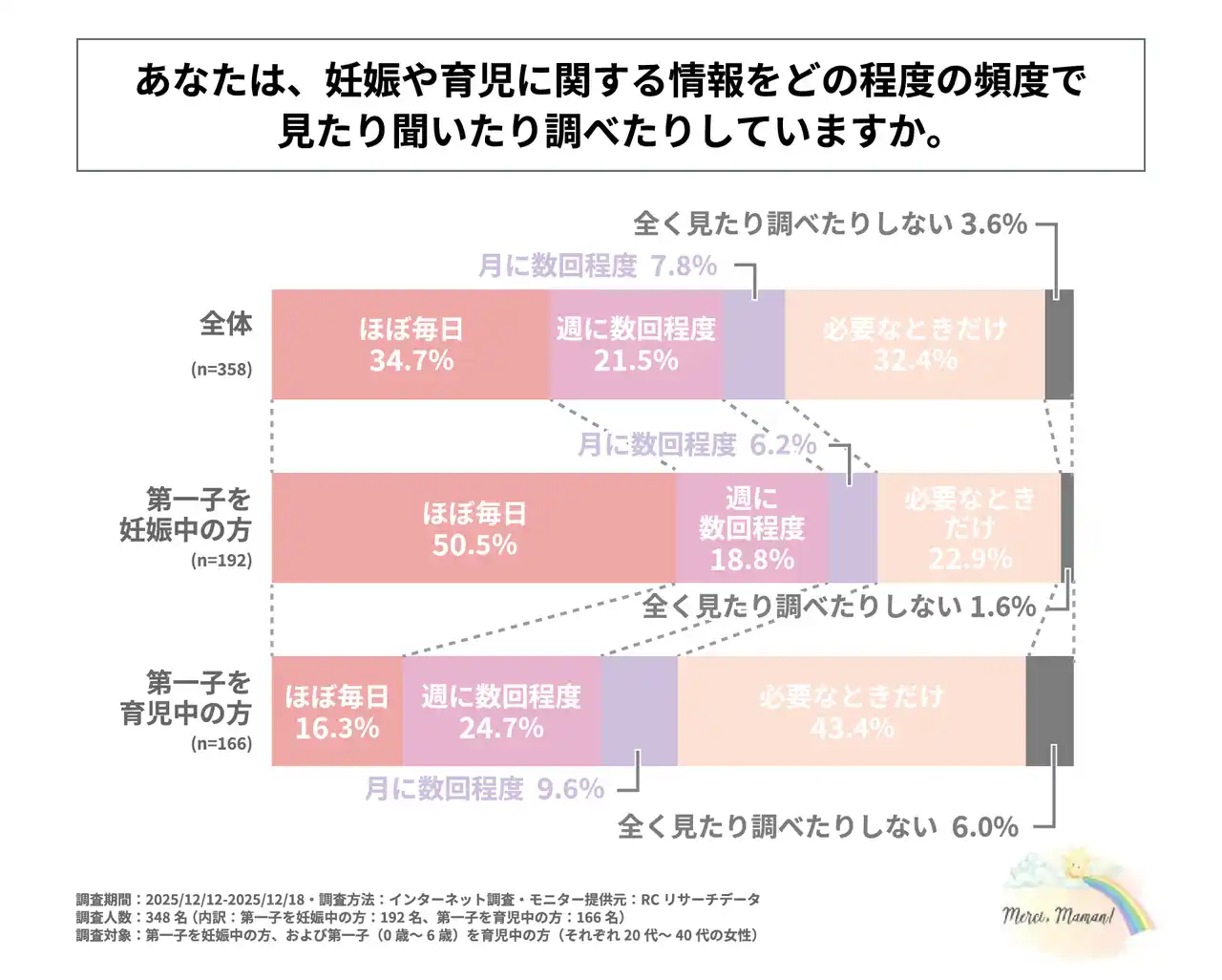 調査人数:358名 【内訳:第一子を妊娠中の方192名、第一子(0歳~6歳)を育児中の方166名】 |