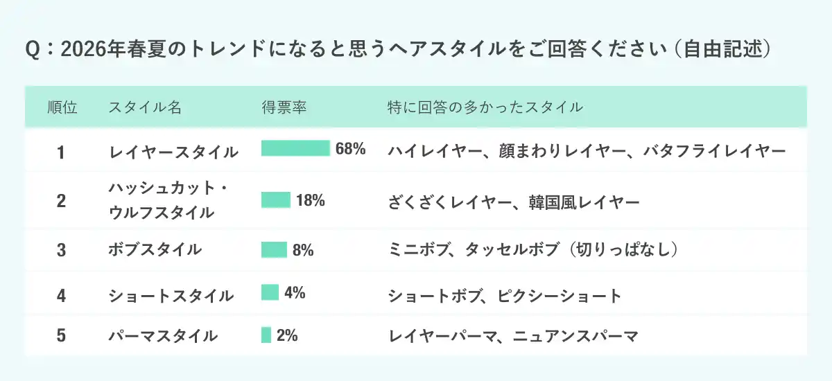 また、昨年は「重めスタイル」や「まとまりのあるボブ」も上位にランクインしていましたが、2026年春夏は韓国トレンドやY2Kブームの影響を受け、「ハッシュカット」や「ウルフスタイル」が第2位に浮上しました。 |