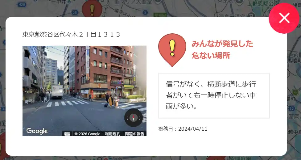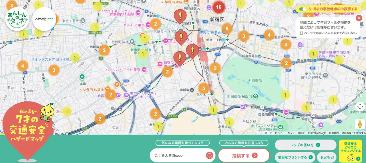 こくみん共済 coop が金沢大学と共同で開発しました。警察庁が公表する交通事故統計情報のオープンデータ合計34,072件の事故情報を反映しています(2025年7月現在)。過去に交通事故が起こった場所が分かりやすく表示されるため、通学や通勤、お出かけ前など、特に注意すべき場所を調べることが可能なツールです。身近にある危ない場所や交通安全に関する取り組みが行われている場所を、誰でも投稿することも可能で、利用者全体で情報を共有することができます。 |