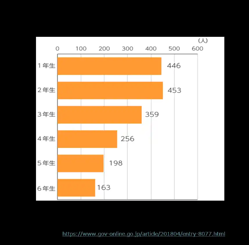 学年別にみると、小学校1年生は446人で、最も少ないのは小学校6年生の163人となっており、小学1年生の歩行中の死者・重傷者は6年生の約2.7倍に上ります。 |
