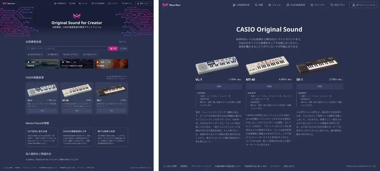 ※ 無料プランは商用利用不可。 今回「Waves Place」で、当社の電子キーボード「VL-1」、「SK-1」、「MT-40」の公式音源を販売します。これにより、AI効果音生成サービスからオリジナルサウンドを提供するプラットフォームにバージョンアップしました。AIによる自由度の高い効果音生成に加えて、1980年代の音楽シーンを支えたモデルの独自音源を手軽に取得できるようになり、サウンドクリエイターの創作の幅をさらに広げます。 |