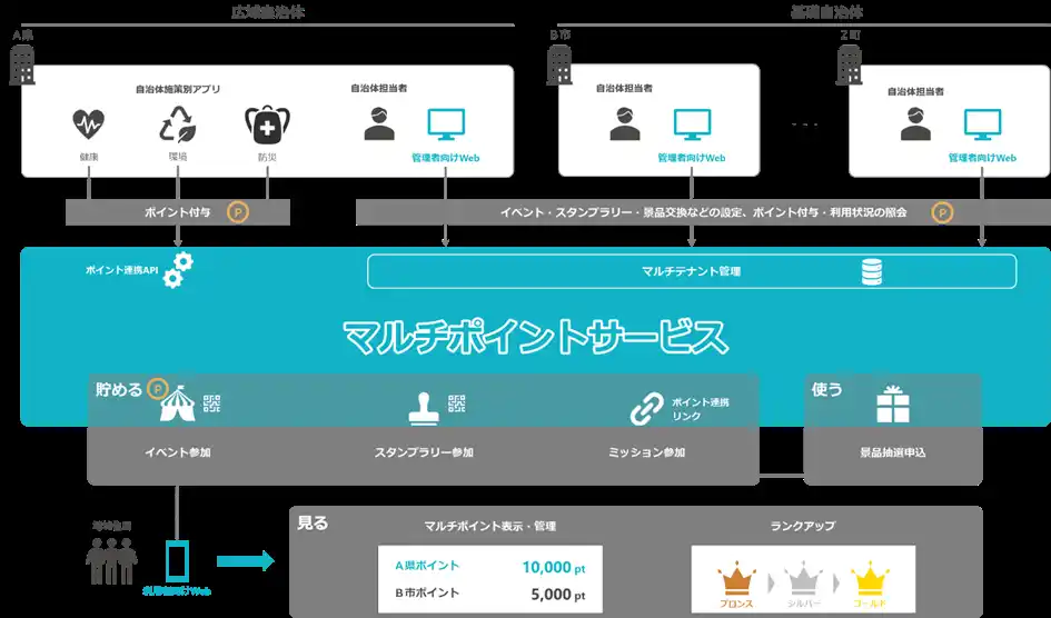 「マルチポイントサービス」は、県や市町村など複数の自治体ポイントを単一基盤で統合することを可能にした、Webアプリ方式のマルチテナント型ポイント基盤サービスです。 |