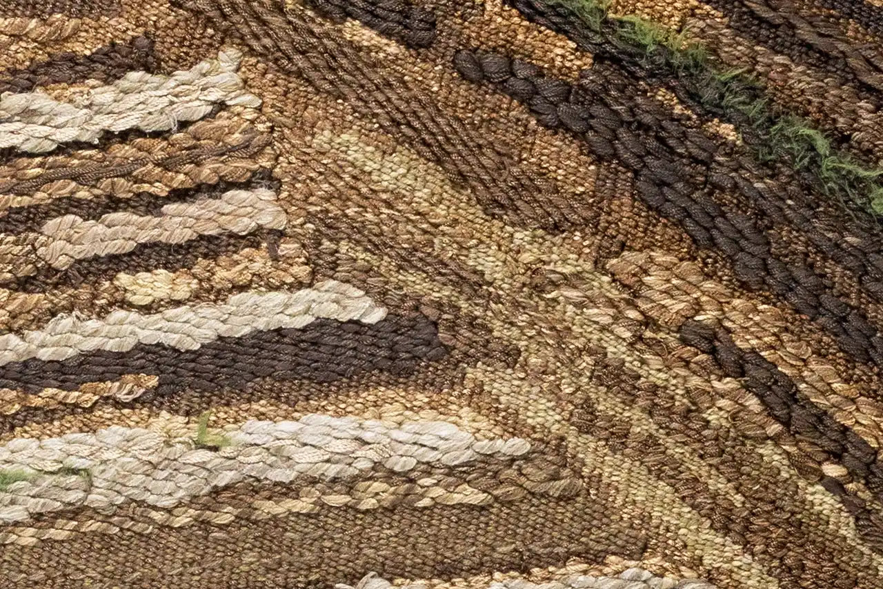 柄を表現する緯糸を手作業で織り込む、絵画的表現に優れた織技法「綴織」によって、長い歳月をかけて形成される自然界の堆積「地層」を表現しました。麻、紙、ウール、レーヨンなど多様な素材を用い、糸の太さや織組織の違いを組み合わせながら、異なる織のラインを幾重にも積み重ねています。時間の堆積を思わせる奥行きとリズムを持つ作品です。 |