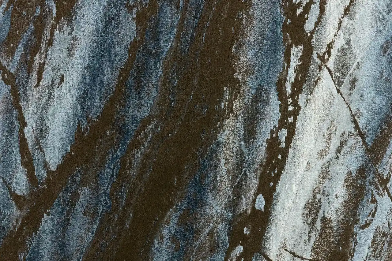 オニキスの吸い込まれるような透明感と静謐な美しさを表現した作品です。タフティングによる繊細な石目調の基布に2色の染料を流し込み、グラデーションで染め上げることで、層の重なりを表現しました。凛とした静けさと大胆さを併せ持つ、強い存在感のある作品です。 |