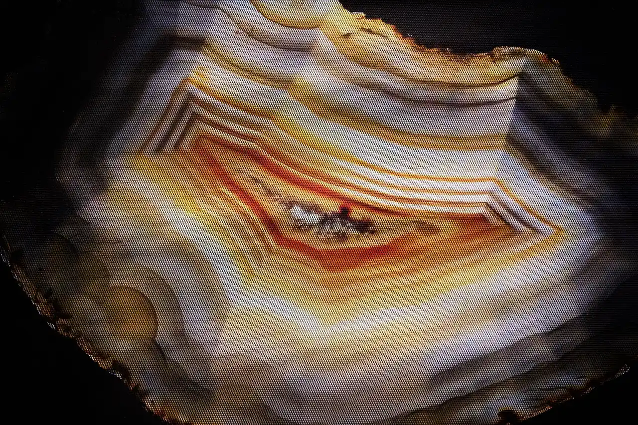 地層や鉱石が長い時間の中で積み重なって形成されるように、織物もまた、糸を重ねることで生まれる“時間の痕跡”です。本展示では、「地層」という自然の積層と、「織物」という糸の積層を重ね合わせることで、目には見えない時間の流れや蓄積を可視化することを目指しました。 |