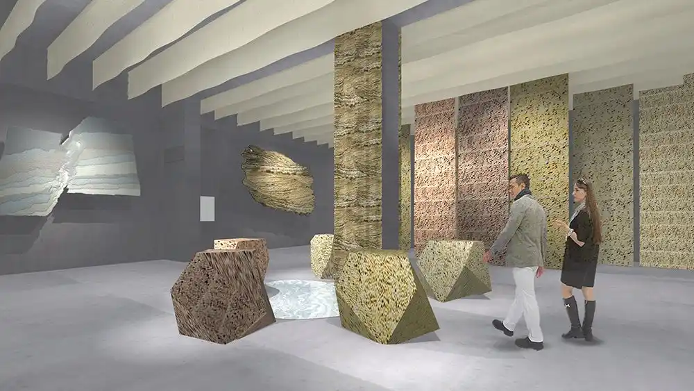 近年高まる、建築・インテリア空間に自然素材の質感を柔軟に取り入れたいというニーズに対し、本展示では、石や土壁といった 硬質な素材がもつ表情はそのままに、触れた時に心地よい織物としての提案を行います。椅子張やクッション、パーティションなど、実用的なインテリア用途への展開も可能です。また、さまざまな質感を、空間のスケールや光環境に応じて選び分けられる構成と することで、意匠表現にとどまらず、空間の重心や境界、雰囲気を静かに支える「空間の中で役割を担う質感」として設計に 組み込める、新たな織物の可能性を提示します。 |