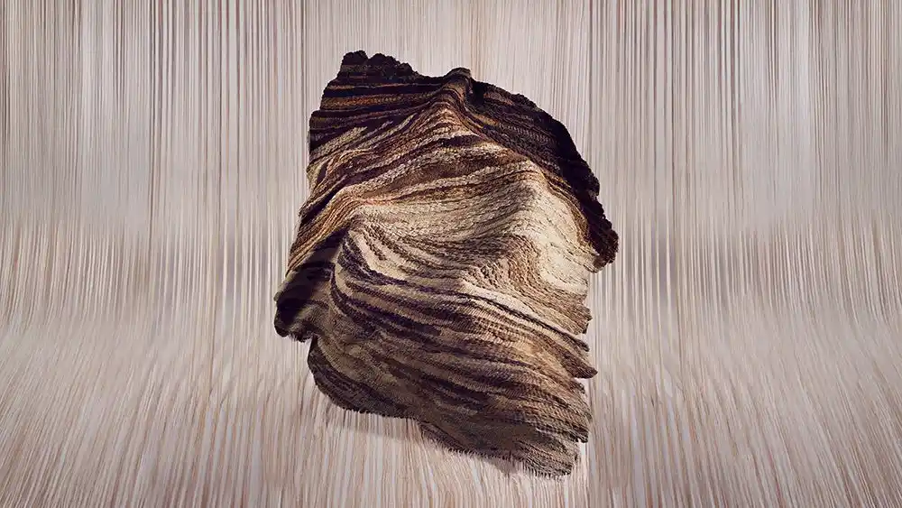 会場では、堆積や圧縮、隆起といった地層形成のプロセスを手掛かりに、織の技法が生み出す質感を立体的に体感できる空間を展開。熟練の技術者が巨大な織機を用いて手織りで織り上げる迫力ある綴織アートワークをはじめ、絹糸や金糸、螺鈿、フィルムなどを織り込んだ作品、リアルな質感を追求した実用的な機械織り作品まで、多様な表現を一堂に紹介します。アートディレクターに照明デザイナーの岡安 泉氏を迎え、光の当たり方や見る距離によって変化するテキスタイルの表情を、視覚と触感の両面から味わえる展示としました。 |