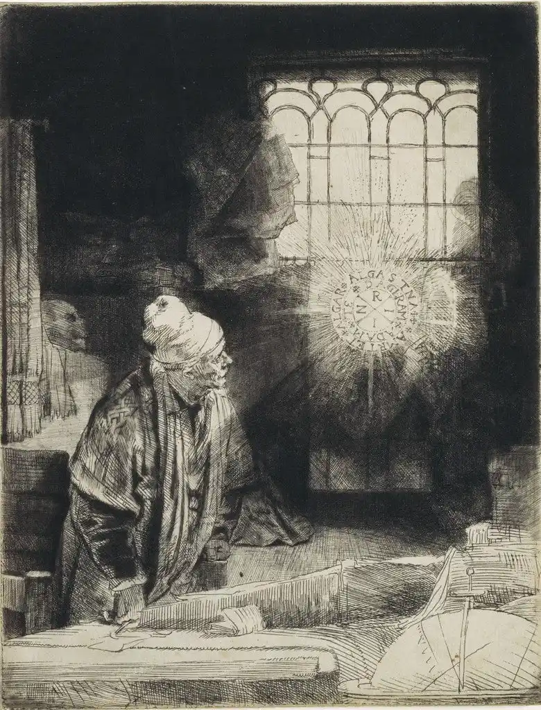 レンブラント・ハルメンスゾーン・ファン・レイン《書斎の学者(ファウスト)》1652年頃、エッチング、ビュラン、ドライポイント、国立西洋美術館 |