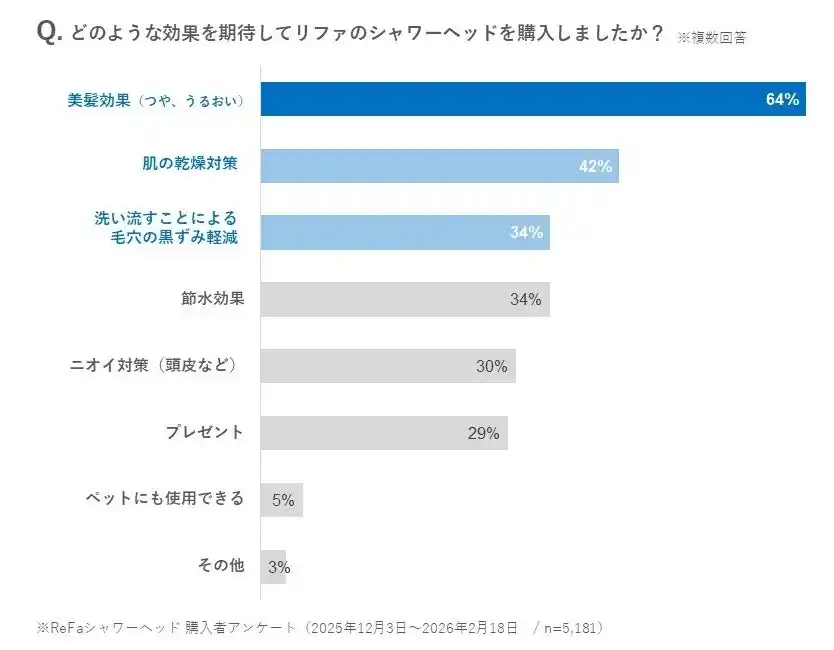 また、MTGオンラインショップでの購入者を対象としたアンケート(n=5,181)では、ReFaのシャワーヘッドに期待する効果として、「美髪効果(つや、うるおい)」が64%と最も多く、次いで「肌の乾燥対策」(42%)、「洗い流すことによる毛穴の黒ずみ軽減」(34%)という結果となりました。 |