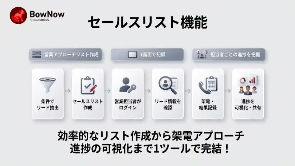こうした課題を解消するため、BowNowは従来のマーケティング機能に加えて、営業担当者が自らツールにログインし、リストを確認しながら架電し、その結果をその場で記録できる「セールス機能」の強化に着手。営業現場の生産性向上を実現する機能として「セールスリスト」を開発いたしました。 |