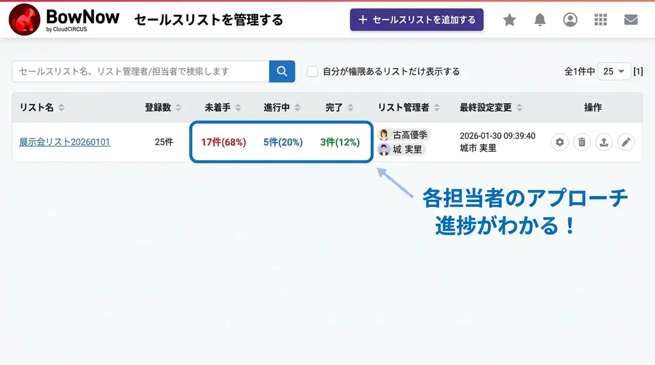 スターティアホールディングス株式会社(本社:東京都、代表取締役:本郷秀之、証券コード:3393)は、連結子会社のデジタルマーケティング事業を手掛けるクラウドサーカス株式会社(本社:東京都、代表取締役社長:金井章浩)が提供するマーケティングオートメーション(MA)ツール「BowNow(バウナウ)」において、営業活動に特化した新機能「セールスリスト」をリリースしたことをお知らせいたします。 |