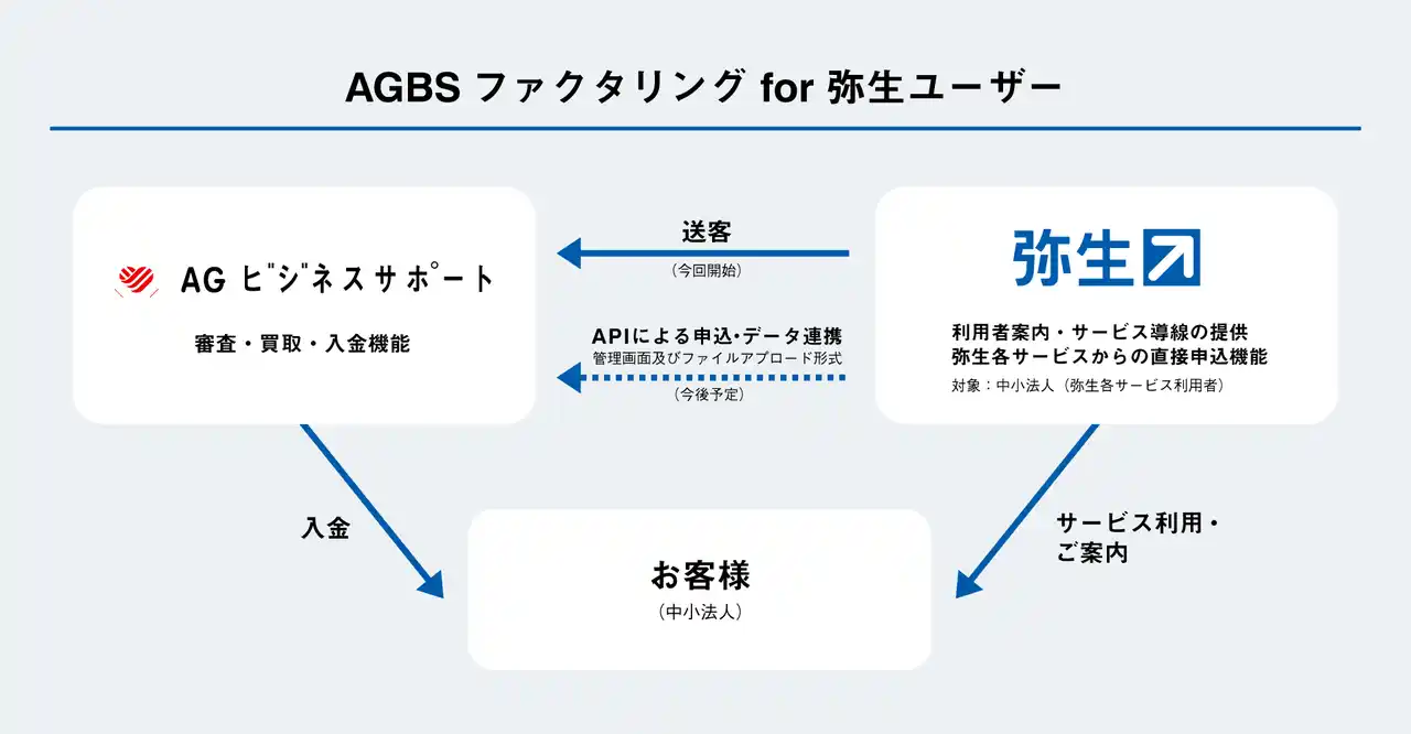 弥生株式会社(本社:東京都千代田区、代表取締役 社長執行役員 兼 CEO:武藤健一郎、以下「弥生」)は、アイフル株式会社(本社:京都府京都市下京区、代表取締役社長:福田 光秀、以下「アイフル」)のグループ会社であるAGビジネスサポート株式会社(本社:東京都港区、代表取締役社長:深田 裕司、以下「AGビジネスサポート」)と業務提携し、債権買取の申込が可能となる中小事業者向けファクタリングサービス「AGBS ファクタリング for 弥生ユーザー」の提供を開始します。