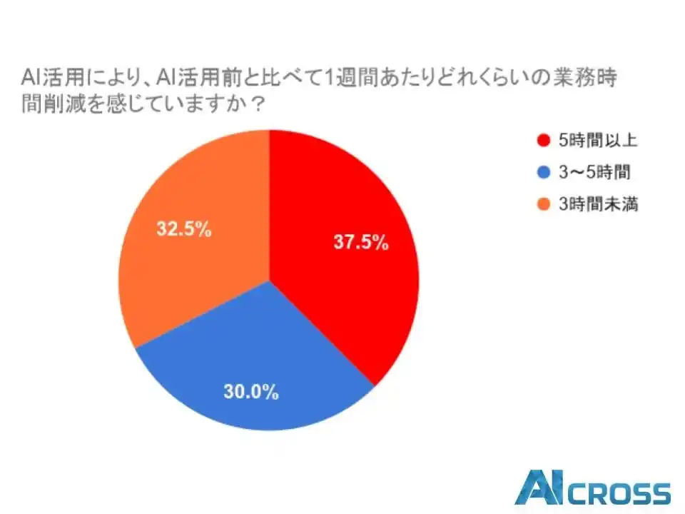 AI CROSS株式会社(本社:東京都港区、代表取締役CEO:原田典子、以下「AI CROSS」)は、正社員を対象に「生成AIの業務活用に関する社内アンケート調査」を実施しました。調査の結果、回答者の約9割(87.5%)が生成AIを「毎日業務で利用している」と回答し、約7割(67.5%)が「週3時間以上の業務時間削減を実感している」ことが明らかになりました。 |