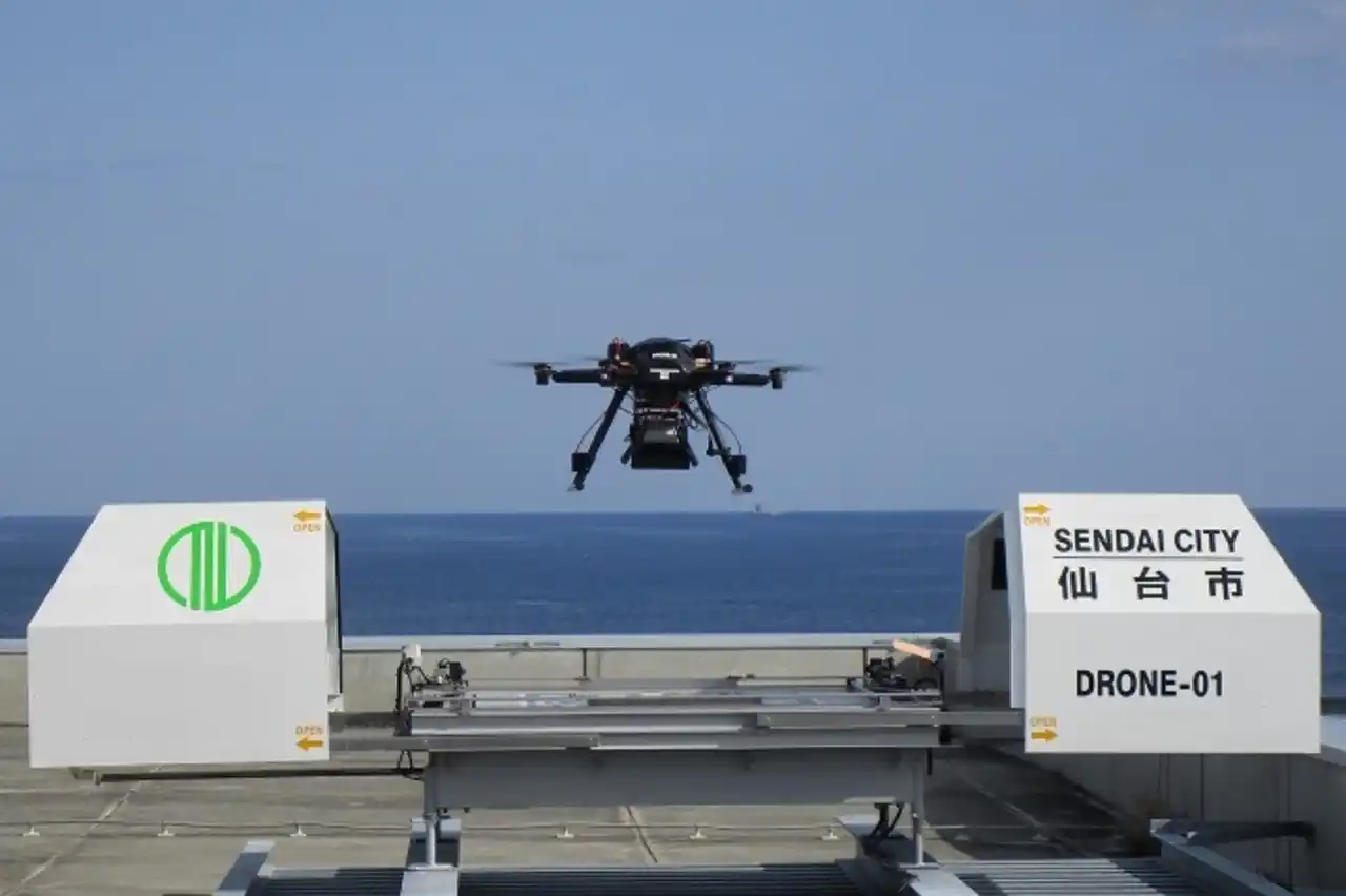 本事業における実証実験の一部では、宮城県仙台市などにおいて既に運用されている「津波避難広報ドローンシステム」を活用し、Jアラートと連動してドローンが自動で発進・放送を行う仕組みの検証が行われました。 |