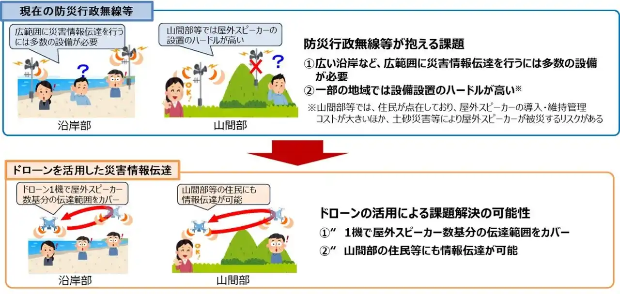 沿岸部と山間部でのドローン活用イメージ(消防庁:「災害情報伝達手段としてのドローンの活用に関する検討会報告書」より) |